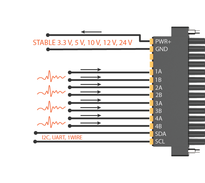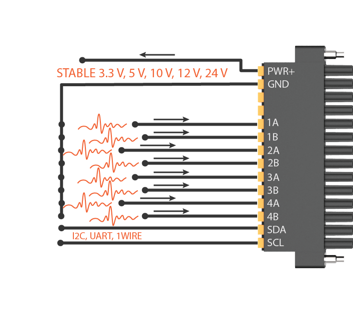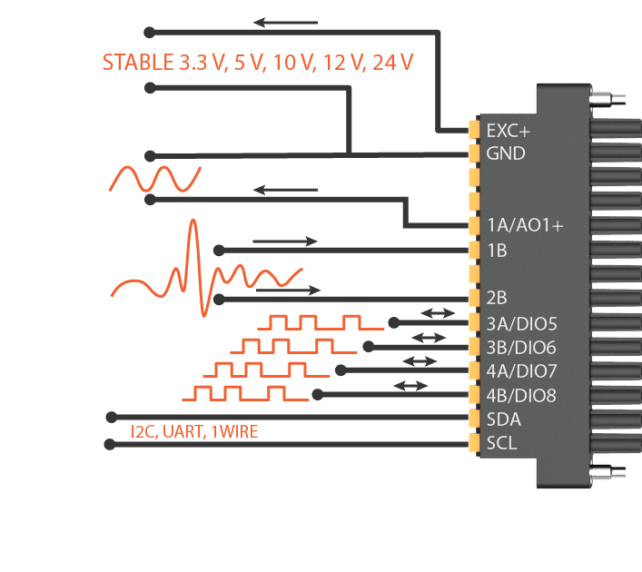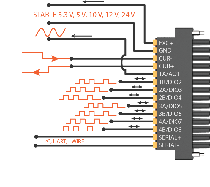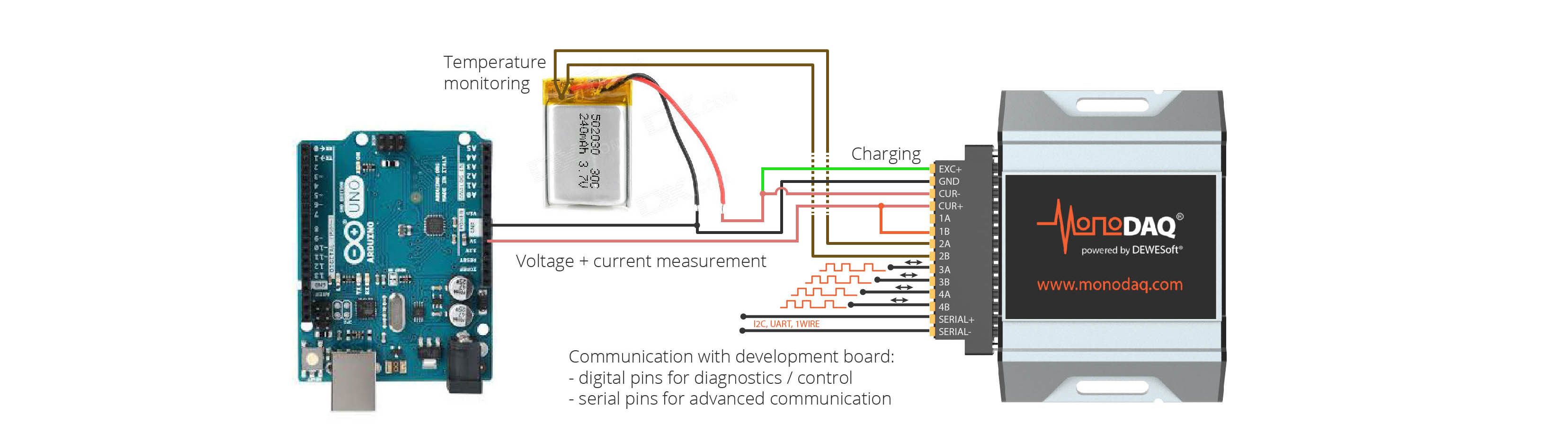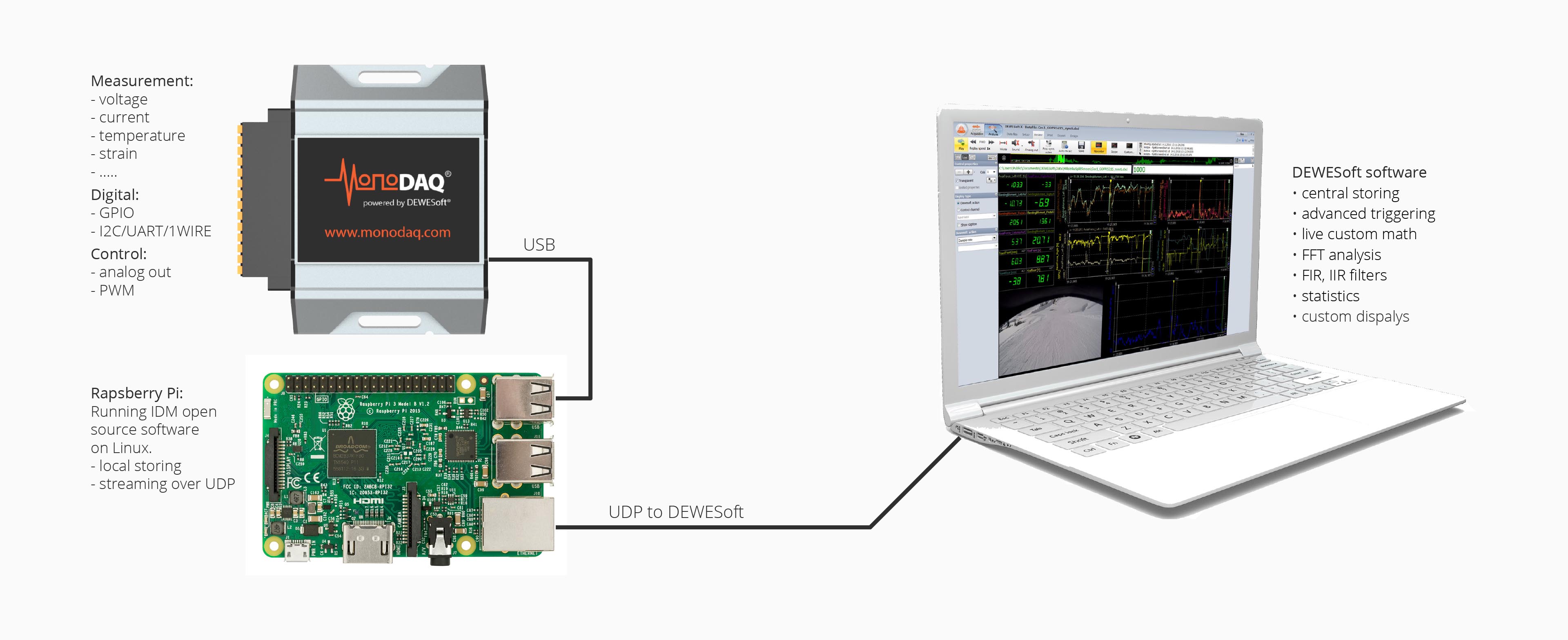 Due to cross-platform support the MonoDAQ-U-X can be used in embedded applications with Raspberry Pi or similar boards. IDM software running in Java is open source to allow custom integrations. Commands and data can be streamed over ethernet to a Windows PC running DEWESoft.